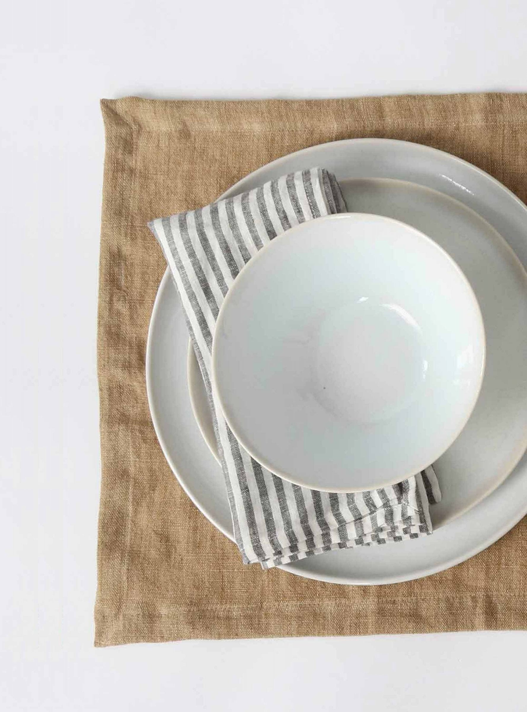 Handgjord bordstablett i 100% linne med dekorativ kantsöm. Att duka med en bordstablett ramar enkelt in dukningen och ger en varm välkomnade känsla kring matbordet. Vacker att använda ensam vid bordet, eller med duk som finns i samma dova färgskala. Stryk den varsamt för ett slätare uttryck eller låt den torktumlas på svag värme för ett behålla den vackra texturen.