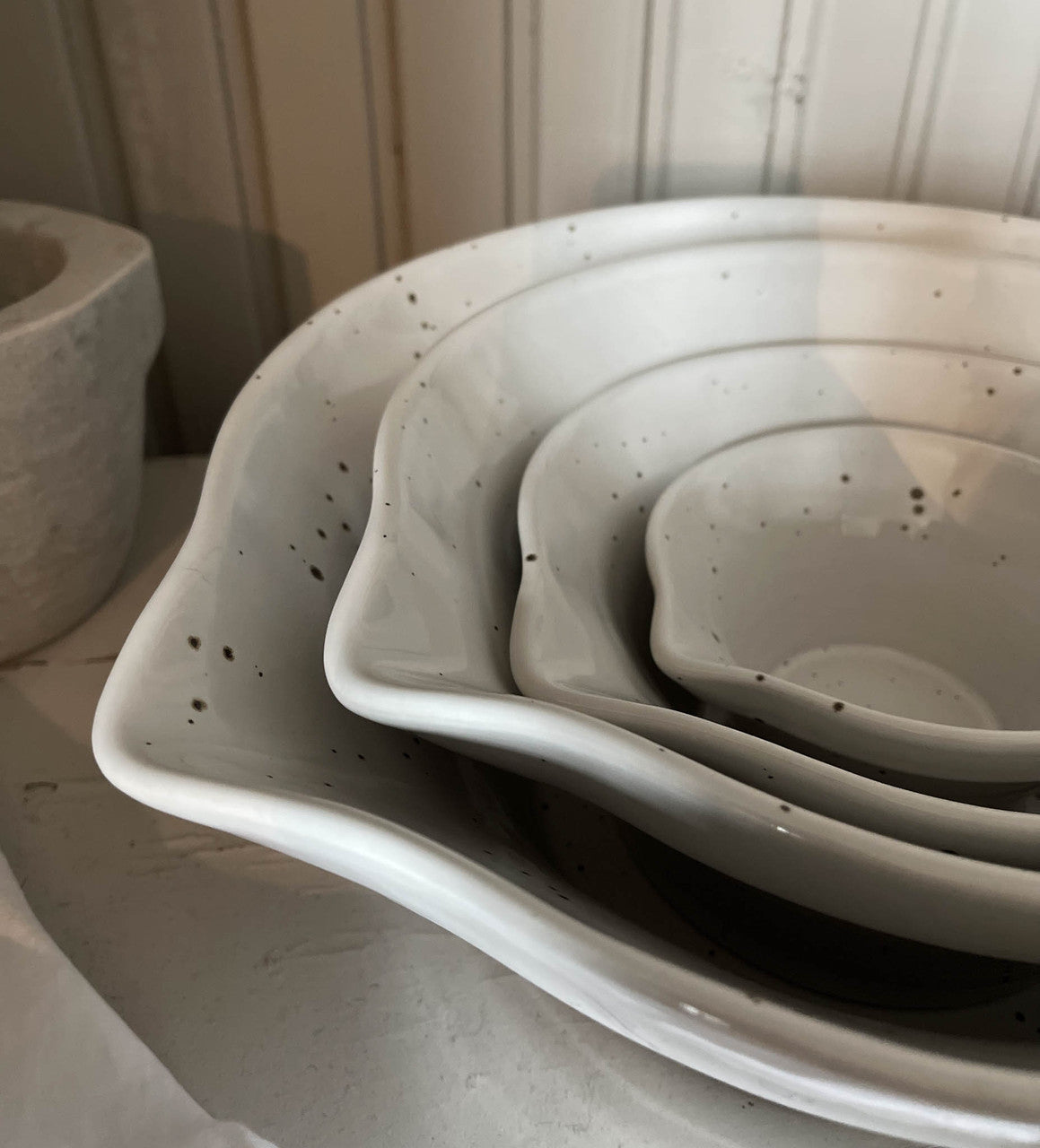 Peep degskål från det svenska företaget PotteryJo. De rustika, handgjorda skålarna har designats med inspiration från den klassiska svenska spillkummen. En vacker och funktionell degskål med hällpip som passar perfekt in i de flesta hem, oavsett om du är ute efter en klassisk bakskål eller ett dekorativt alternativ att servera din sallad i. Med glasyren har PotteryJo gett detta klassiska stengods ett mer modernt utseende. Skålarna finns i fyra glasyrer och fyra storlekar.