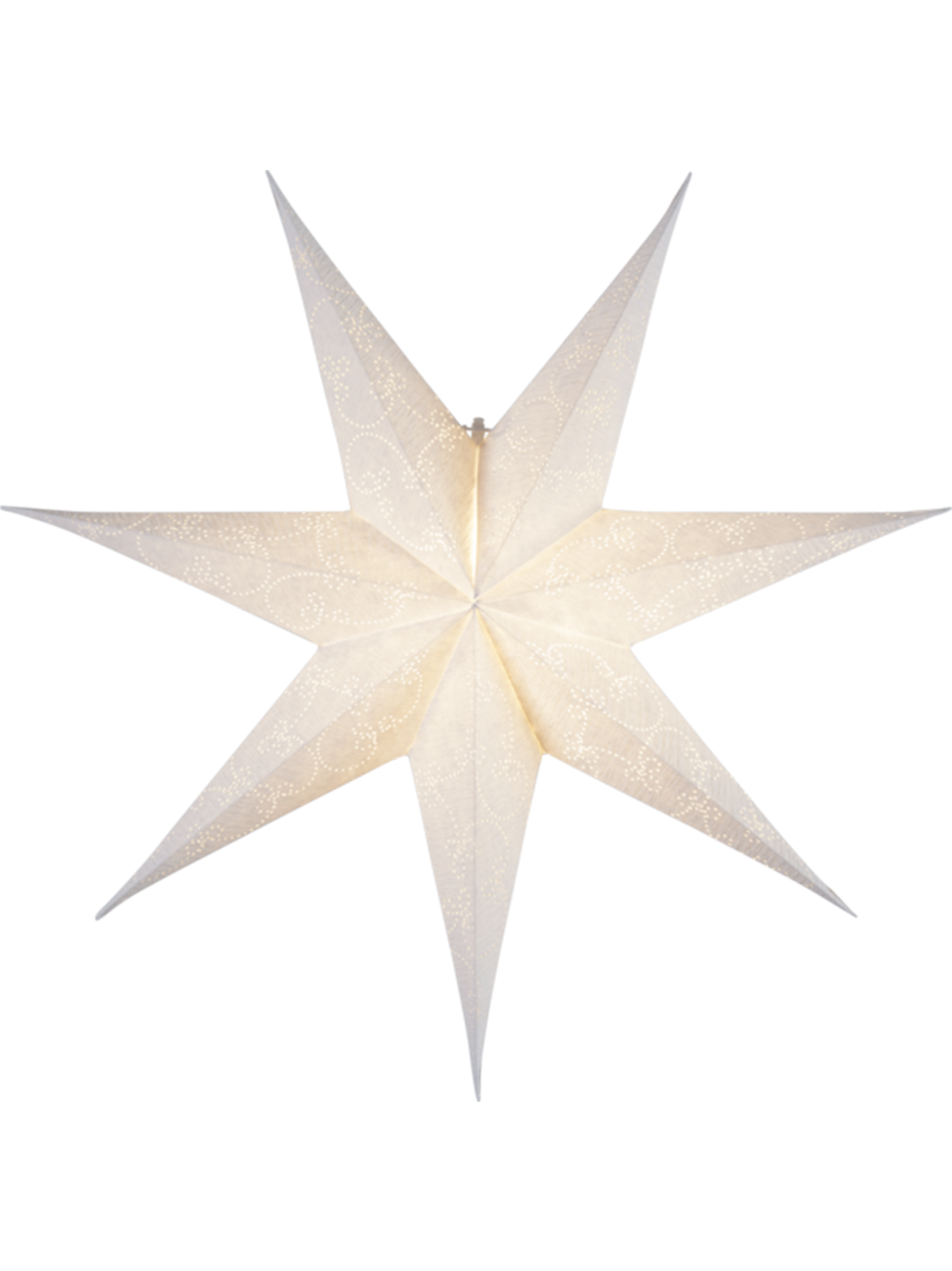 Vit pappersstjärna med hålmönster och struktur. Stämningsfull stjärna att hänga upp i fönstret för att skapa julkänsla. Papper av återvunnen bomull.