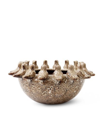 Bird! Denna runda skål i keramik är en verklig pärla för ditt hem. Med sin charmiga och lekfulla design, pryds kanten av små fåglar som står inåt, vilket ger en unik och personlig känsla. Den spräckliga, jordnära tonen på skålen ger ett rustikt och inbjudande uttryck, och varje skål är helt unik i sin spräckliga look. Perfekt för både vardagsbruk och speciella tillfällen, där den inte bara fungerar som en vacker serveringsskål, utan också som en dekorativ detalj på bordet. Denna skål tillför en mysig och livlig känsla till ditt hem, och fåglarna på kanten ger en liten men betydelsefull touch av naturens charm. Skålen är också foodsafe, vilket gör den både vacker och praktisk för att servera allt från sallader och frukt till snacks eller desserter. Låt denna härliga och unika skål bli en del av ditt hem och skapa en personlig och inbjudande atmosfär.