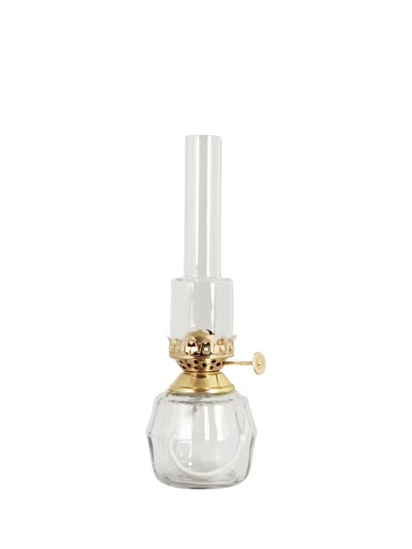 Fotogenlampa i infärgat klarglas. Brännarerör i klarglas och brännare i mässing. Inklusive en veke. Använd gärna Strömshagas lampolja till denna oljelampa, säljs separat.