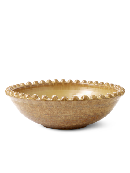 Cherie är en vacker, honungsfärgad skål i keramik som utstrålar både värme och charm. Kanten pryds av små bubblor som ger en lekfull och härlig detalj, vilket gör varje skål unik och personlig. Med sin stora och djupa form är Cherie perfekt för att servera fräscha sallader, frukt eller andra härliga rätter. Skålen är inte bara en vacker dekoration på ditt bord, utan också funktionell. Dess storlek gör den perfekt för både vardagsmåltider och festliga tillfällen. Låt Cherie skål bli en elegant och charmig detalj i ditt hem, och skapa en inbjudande atmosfär vid varje måltid. En riktig centerpiece. Skålen tål ej maskindisk. Denna produkt ingår i Jakobsdals kollektion tillsammans med den norska inredningsstylisten och influencern Marianne Haga Kinder.