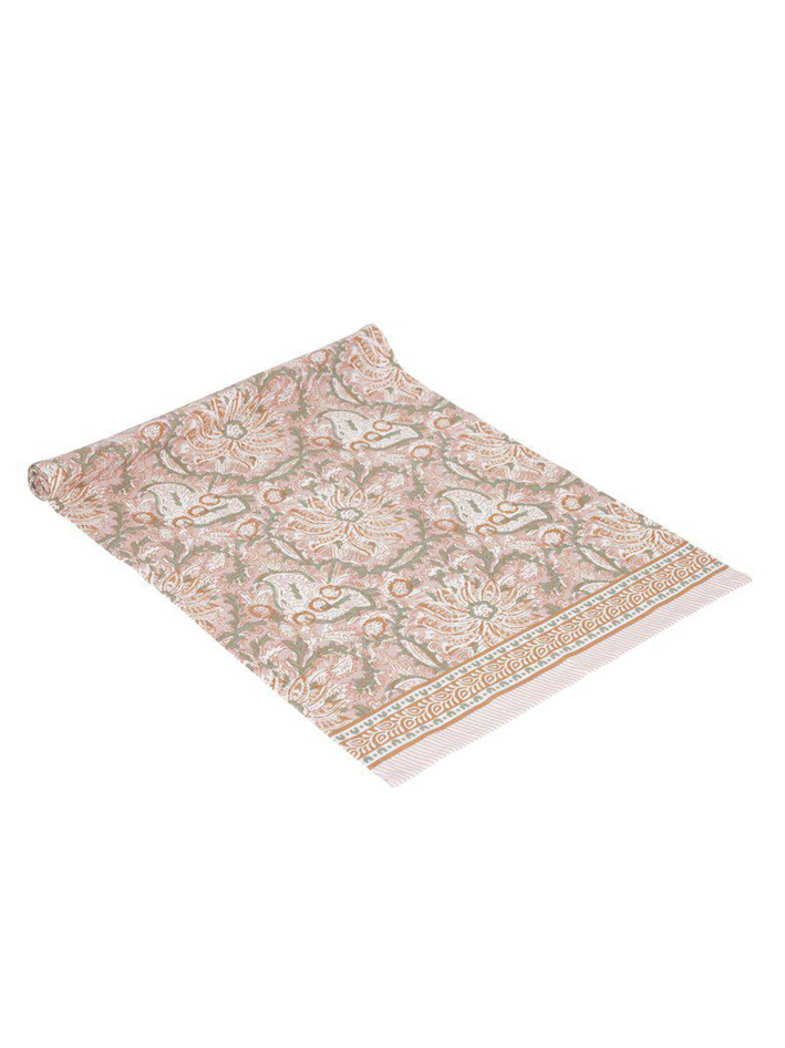 Bordslöpare i 100% bomull med ett modernt och härligt mönster som skapar en fräsch och stilfull känsla i dukningen. Löparen är prydd med en elegant bård runtom som ramar in designen och ger ett harmoniskt och genomtänkt uttryck.