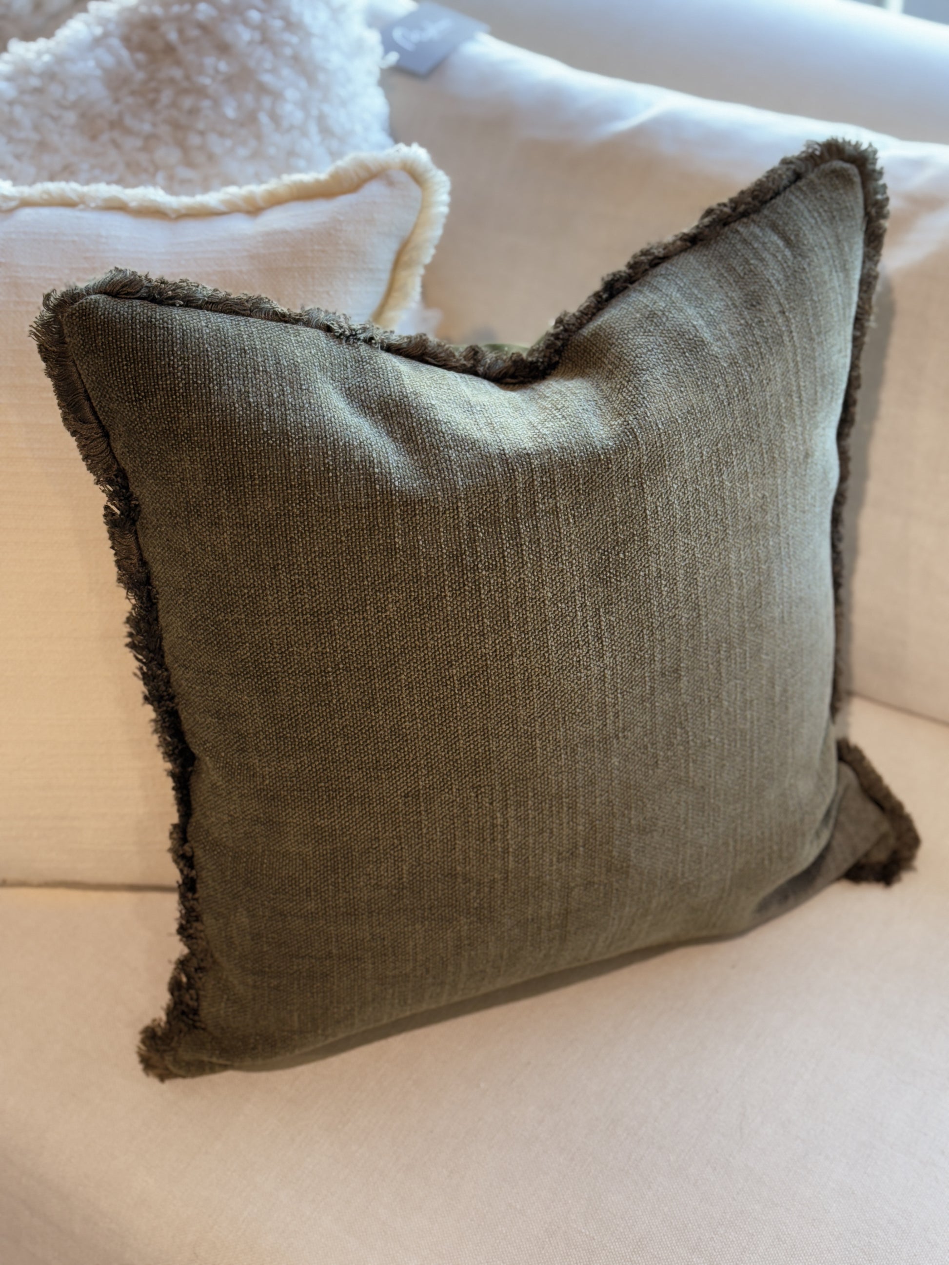 Enfärgat kuddfodral med en fin, subtil lyster, runtom löper en dekorativ, nätt frans som tillför en trendig och sofistikerad känsla.