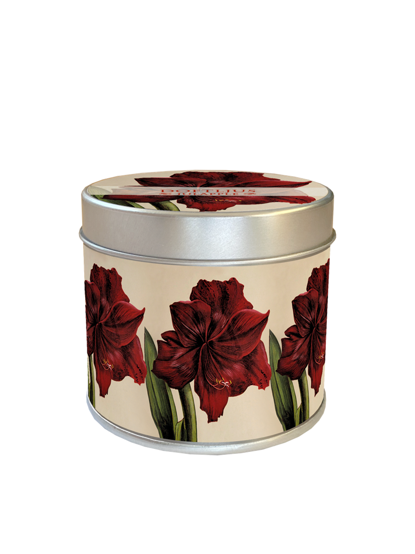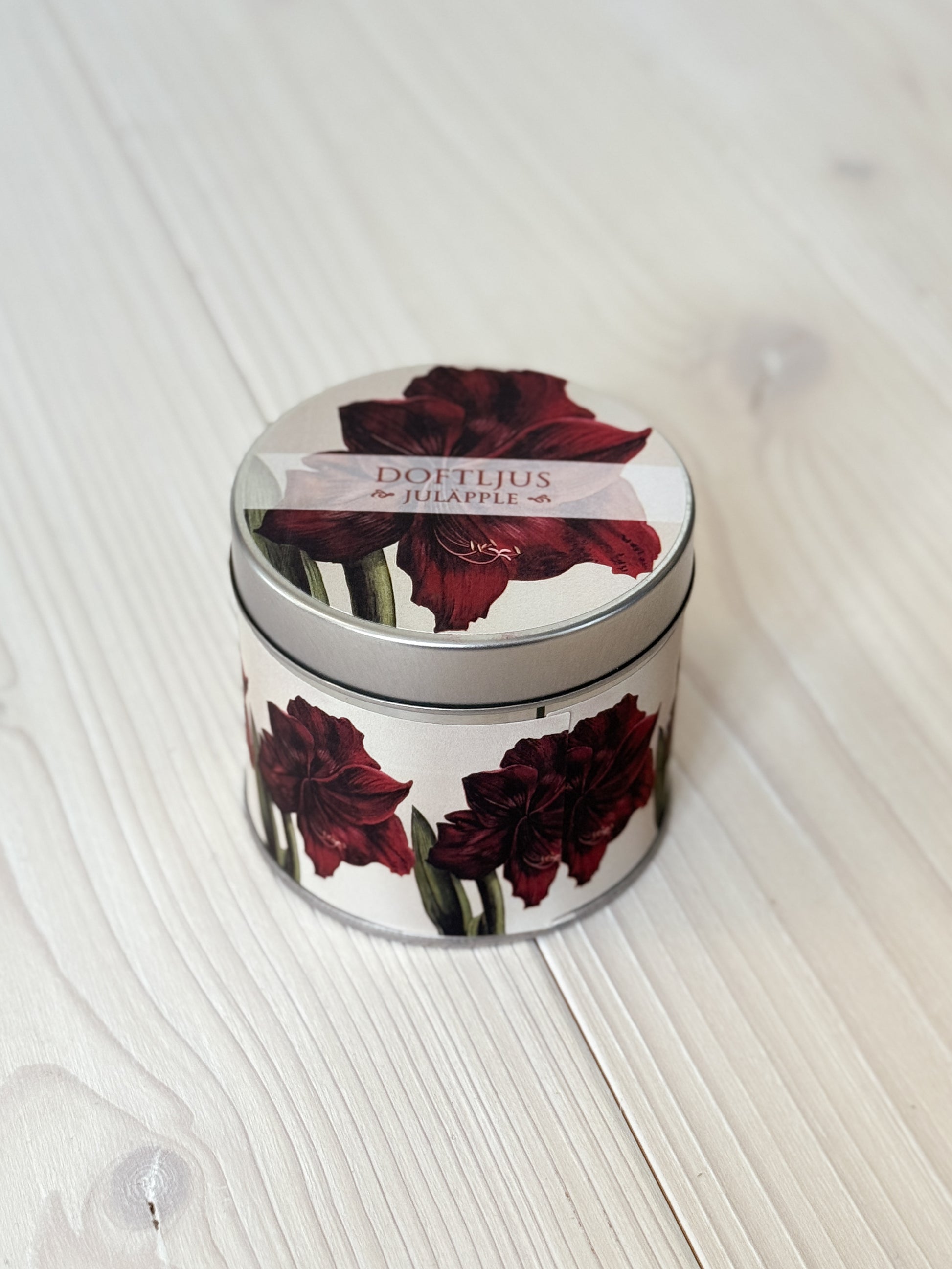 Vackert doftljus i plåtburk med härligt motiv på burken. Doft av juläpple.