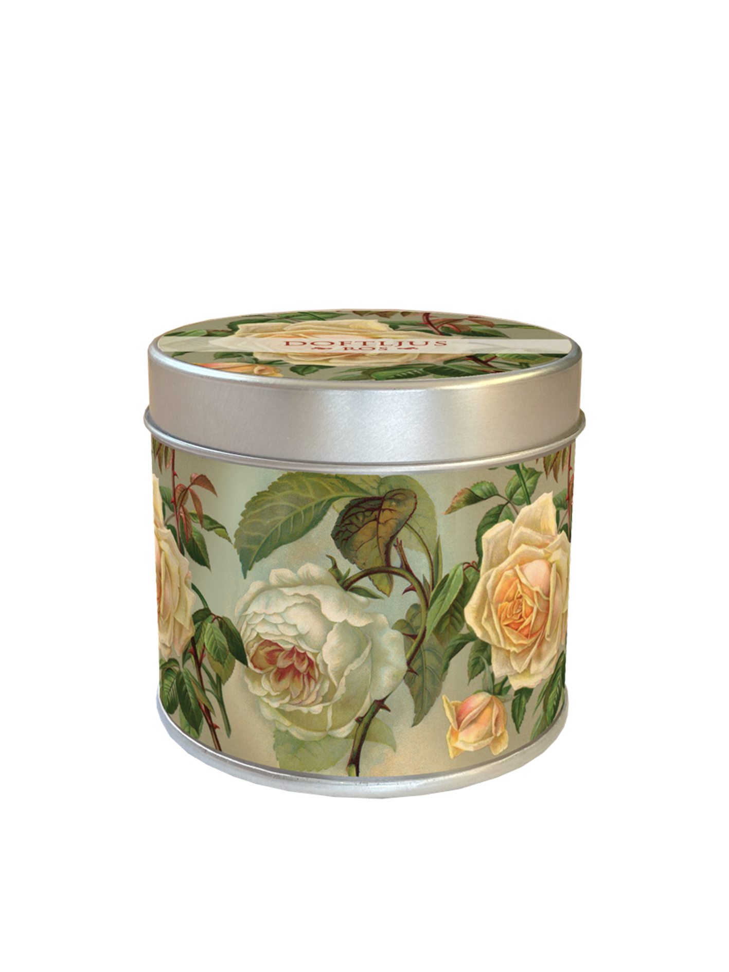 Vackert doftljus i plåtburk med härligt motiv på burken. Doft av ros.