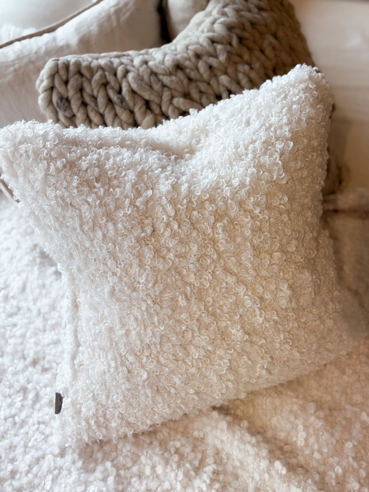 Vitt kuddfodral i vad som känns och ser ut som det mjukaste fårskinn, men är i själva verket vegansk. Den vita tonen är inte allt för kall, för att på så vis inge ge en naturlig känsla.