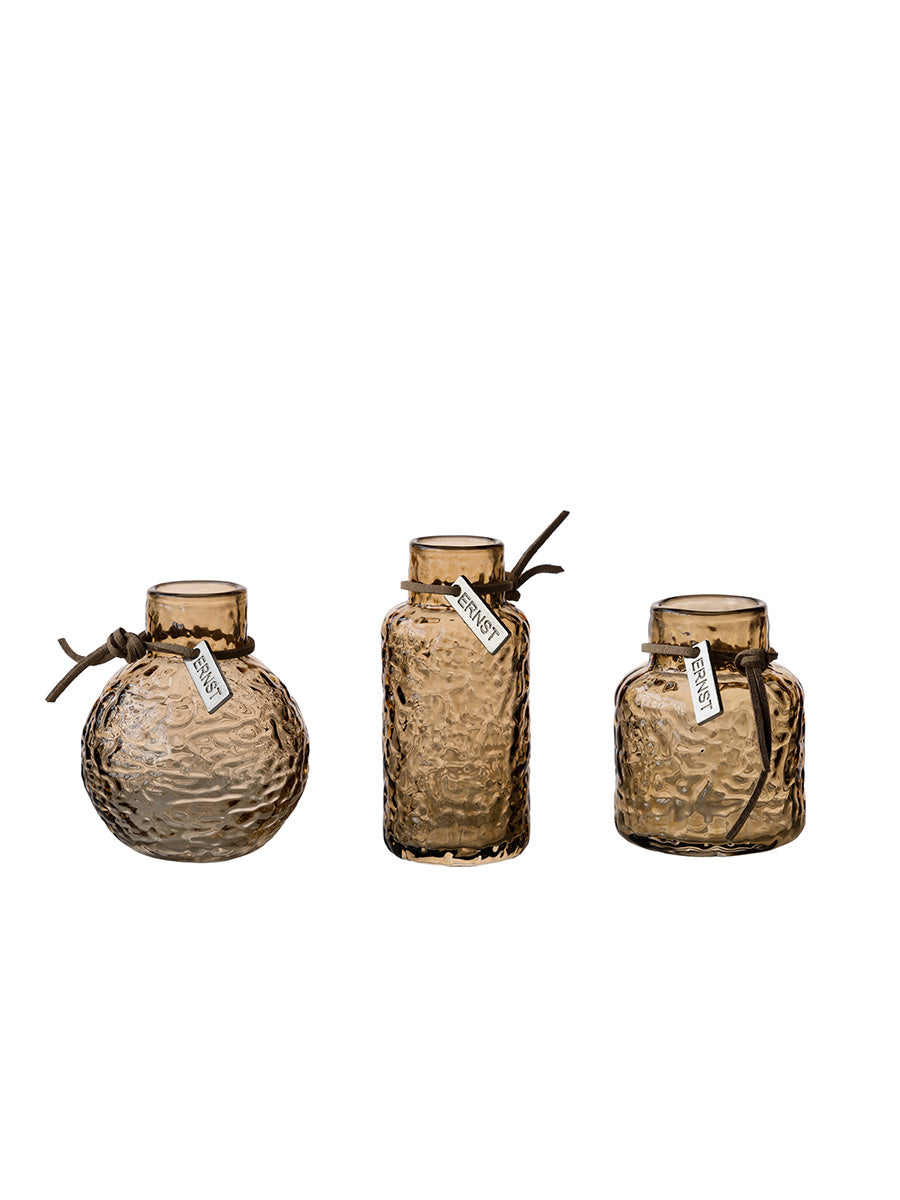 Tre små ERNST bärnstensfärgade vaser med struktur i en presentförpackning – en gåva till den som uppskattar det lilla extra. Perfekt för att låta ett par enkla blomster stå i centrum, som sticklingsvas eller som en vacker detalj på egen hand.