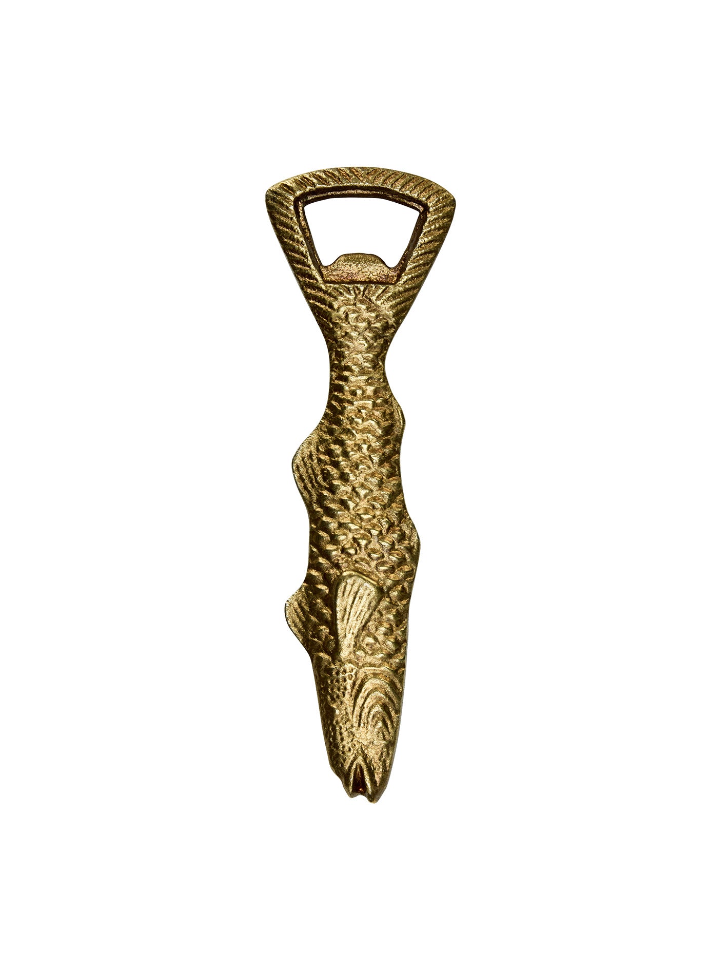 Havsinspirerad flasköppnare i aluminium. Vacker att ha liggande på bordet som en del av inredningen. Subtila kurvor påminner om en glidande fisk. Antik mässingfinish.