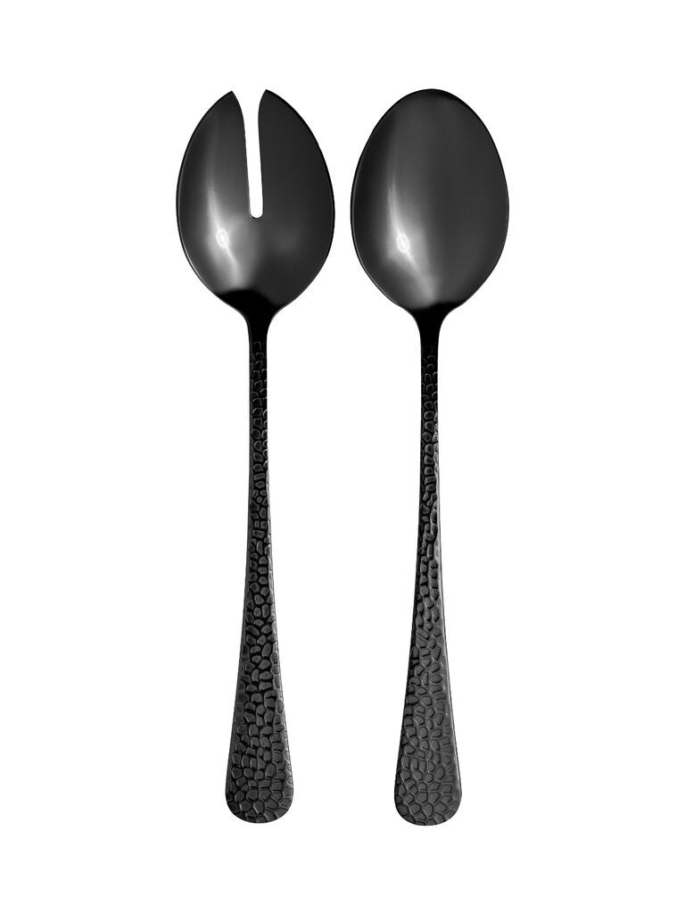 De hamrade stålytorna döljer effektivt fingeravtryck och reflekterar ljus i subtila mönster. Tillverkade helt i rostfritt, polerat stål. Ett uttryck för värme i ett annars kyligt material. Salladsbesticken ligger stadigt i händerna och fungerar lika bra i vardagen som till dukningar där detaljer räknas. Två delar. Levereras i vacker presentbox - perfekt som gåva.
