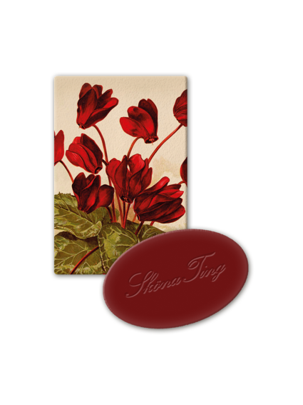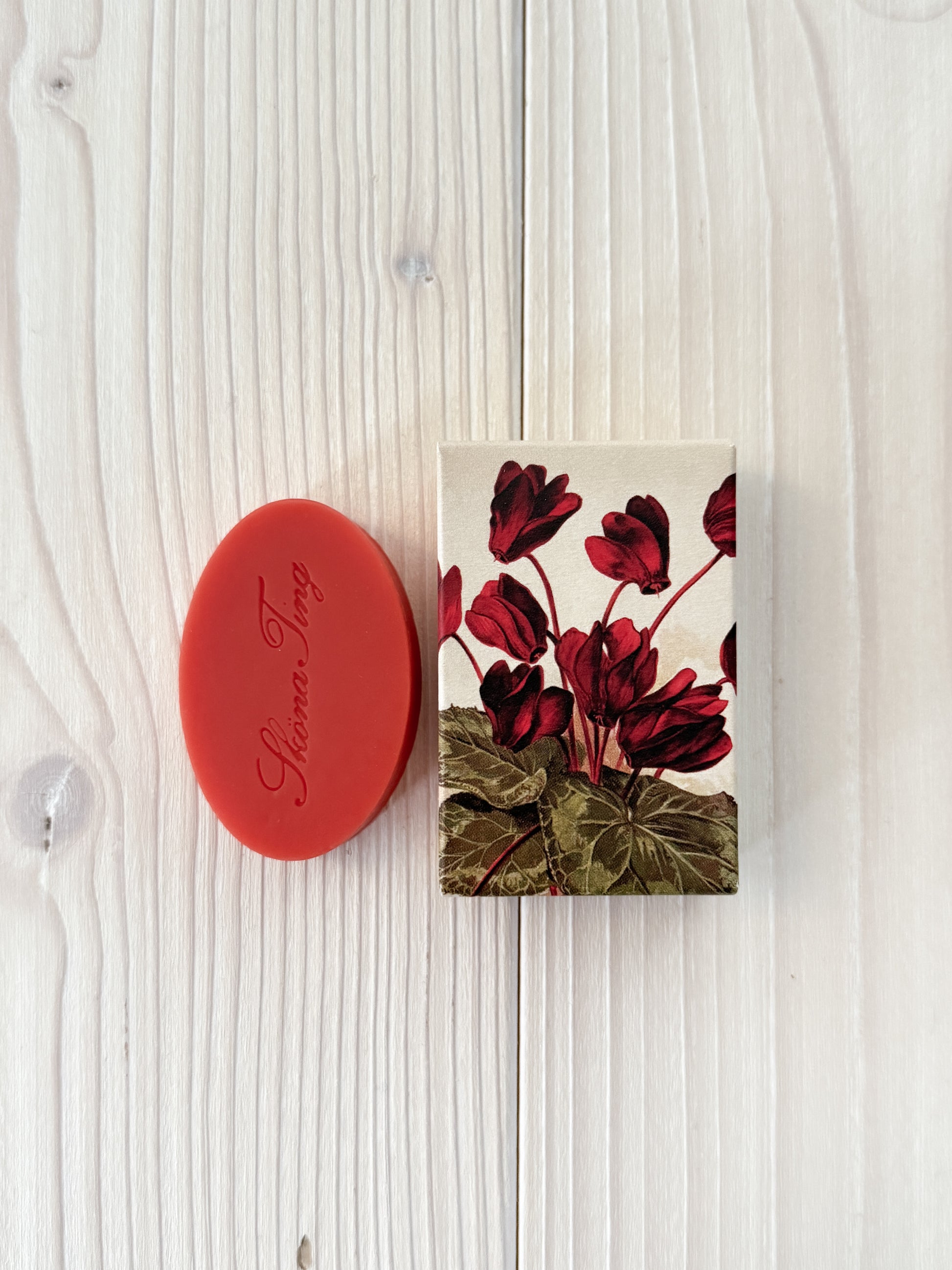 Tvål med doft av juläpple, vackert inslagen i papper med motiv av cyklamen.
