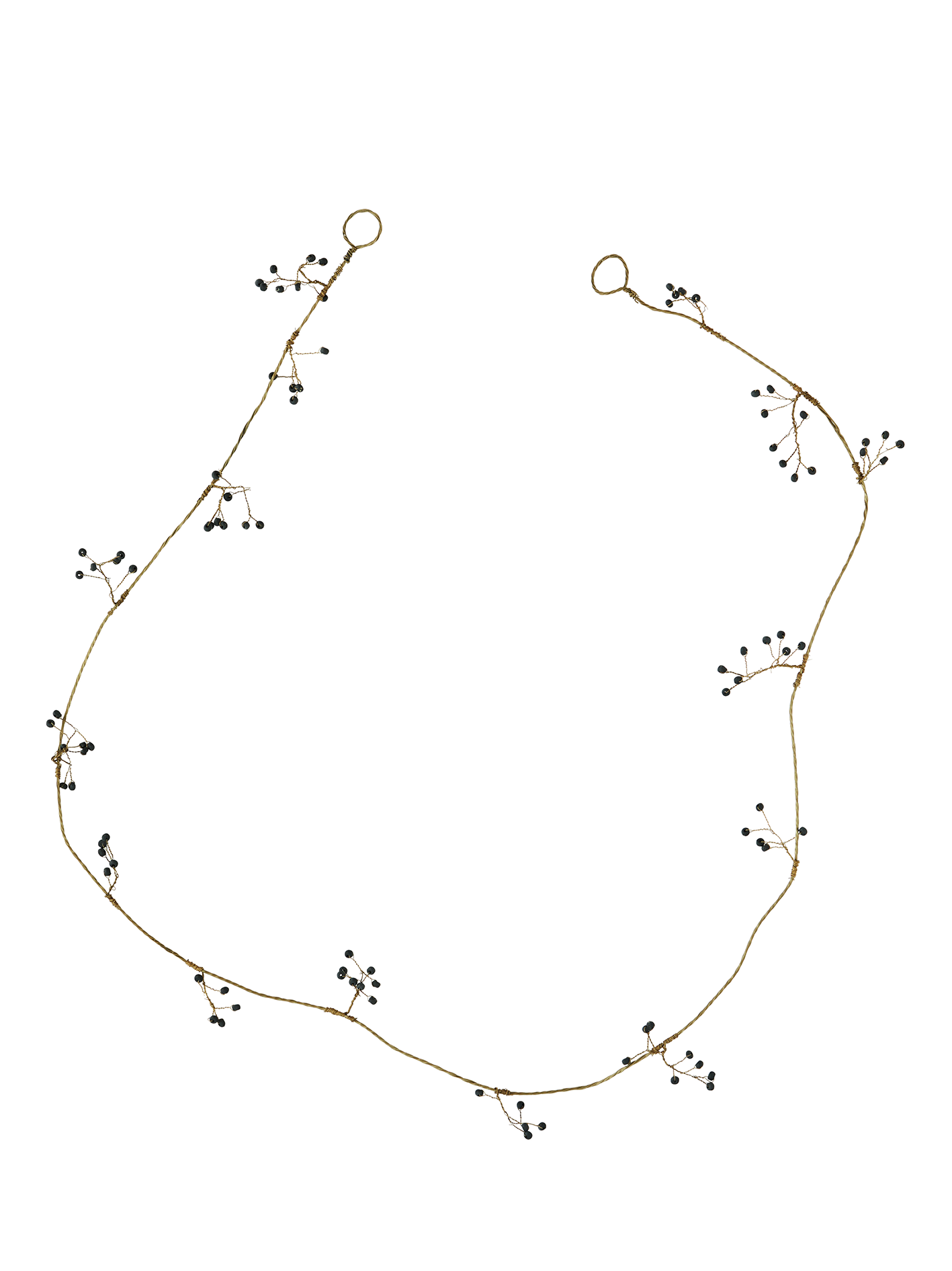 Dekorativ girland i guldfärgad metall med träpärlor i antracit.