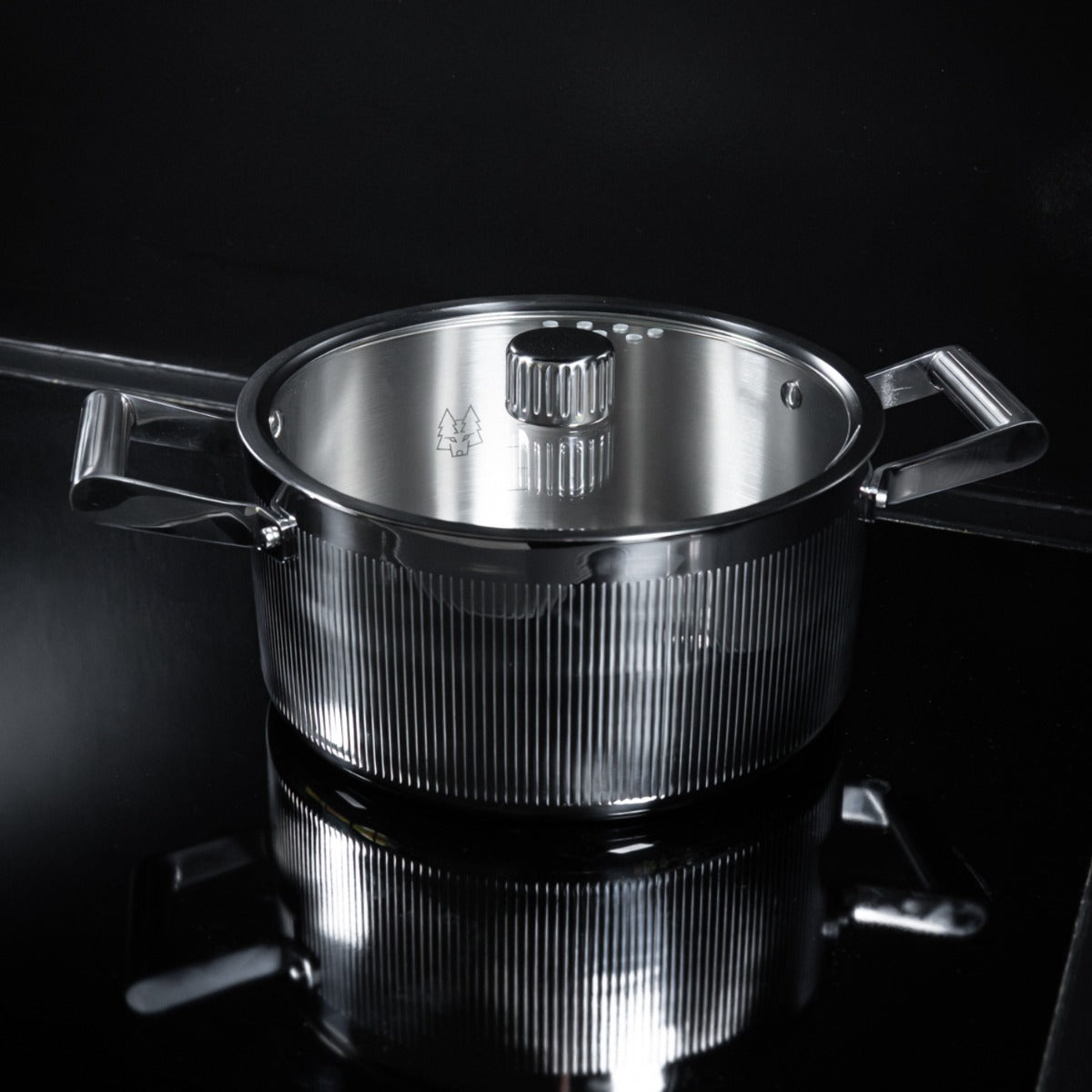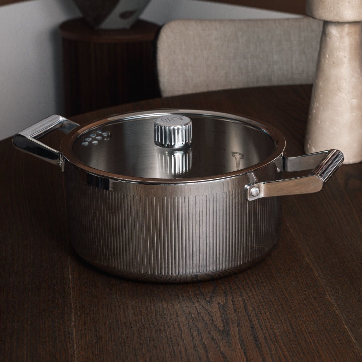 Designen är något som inte skådats. Den räfflade ytan i polerat stål är både visuellt kraftfull och djupt karaktäristisk. Den känns omedelbart igen som GLIMA, och lika mycket som en designikon som ett kokkärl. Lockets små, integrerade hål gör att du alltid har ett inbyggt durkslag nära till hands – en enkel men genial funktion. Som sagt: Prestanda och design möts. Det är vackert.