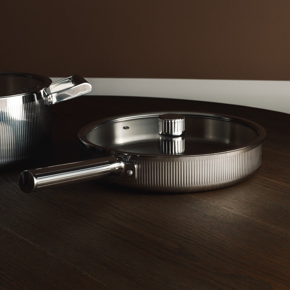 Byggd i fem lager stål, med en perfekt vikt och balans, blir den ett förlängt uttryck för dina händer. Den breda ytan ger plats åt råvarorna att utveckla sina smaker, medan seriens karakteristiska räfflade design ger ett uttryck som är lika djärvt som det är sofistikerat. Den räfflade ytan håller också fingeravtrycken borta samtidigt som den ger en härlig spegeleffekt på matbordet.