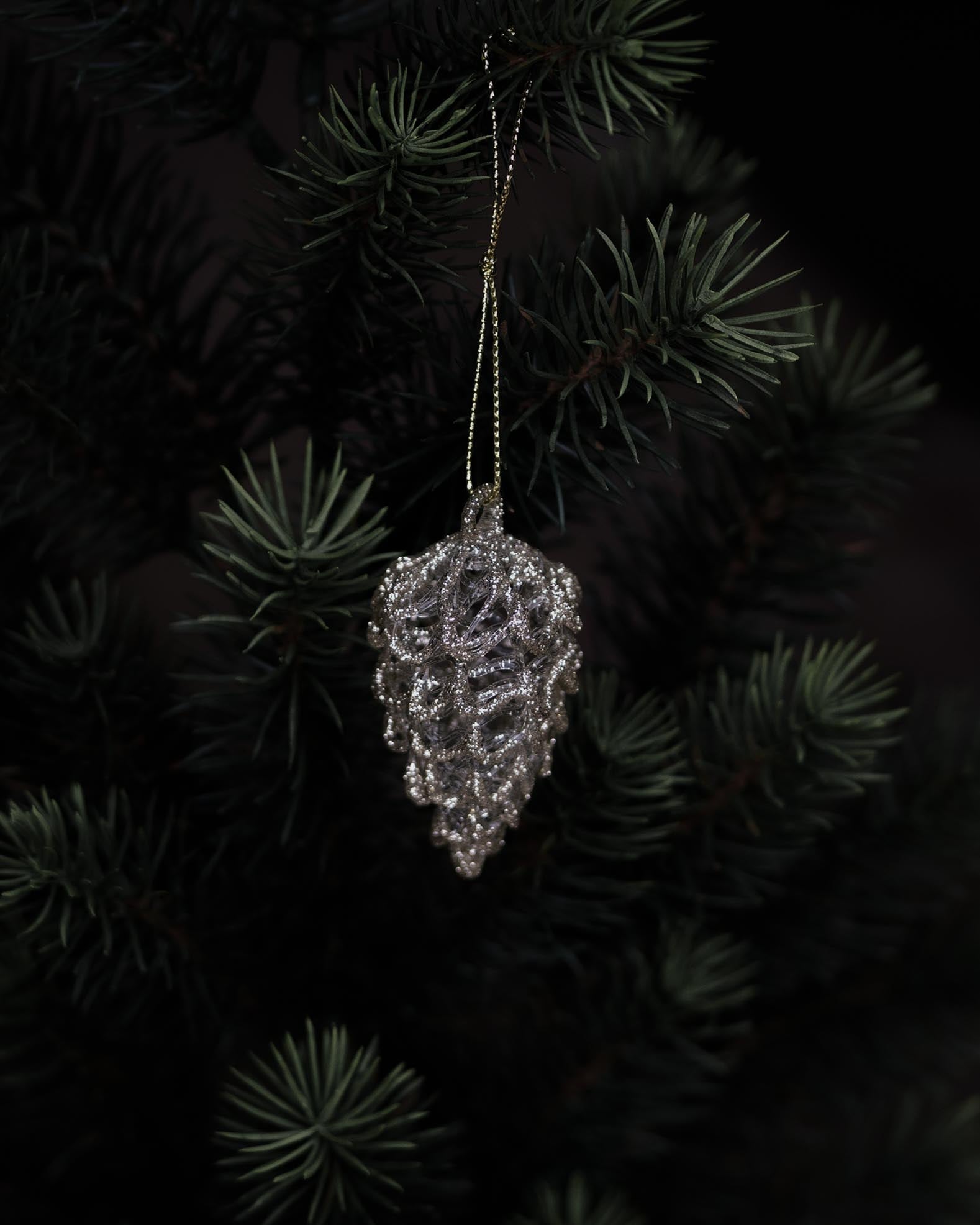 Klä julgranen eller dekorera ett blomsterarrangemang med en glittrig hängande dekoration som ser ut som en kotte. Tillverkad av glas.