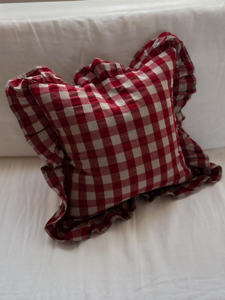 Kuddfodral i bäckebölja med klassiskt rutmönster är en charmig och stilfull detalj i ditt hem. Den eleganta volangen längs kanterna ger en extra touch av romantik, vilket mjukar upp det klassiska utseendet och skapar en inbjudande känsla.