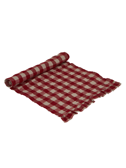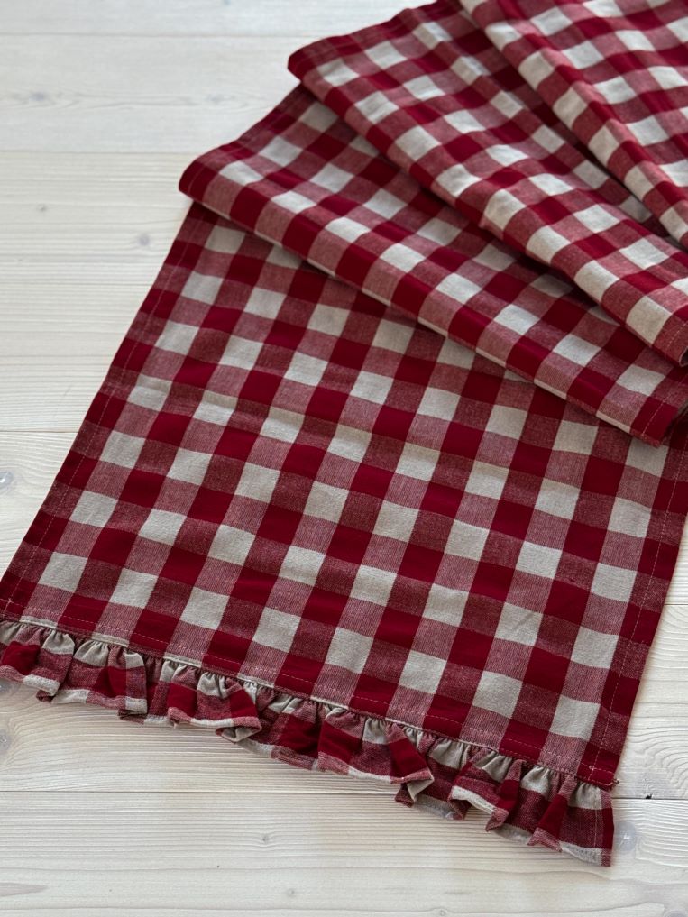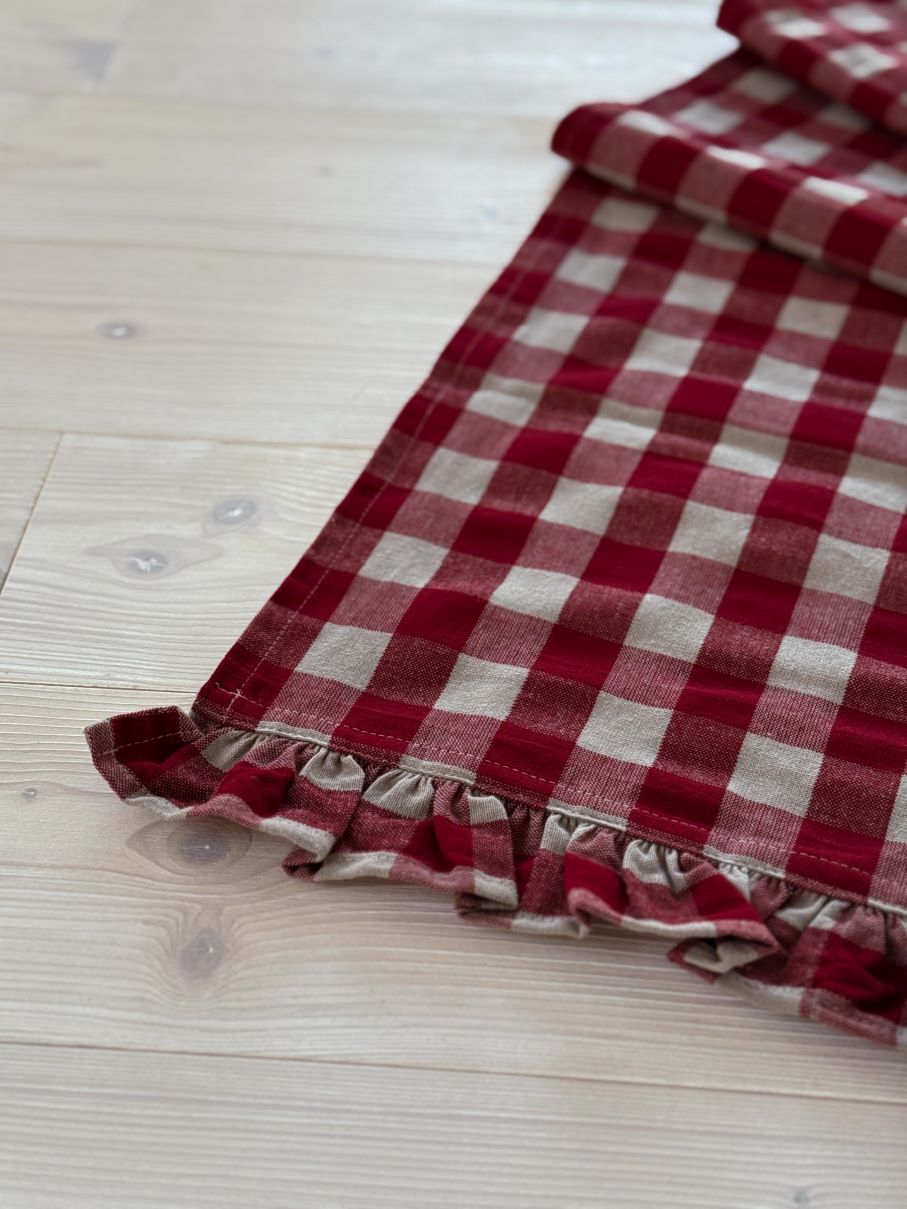 En löpare i bäckebölja med vacker volang på kortsidorna med ett klassiskt rutmönster är en elegant och inbjudande detalj för ditt matbord.