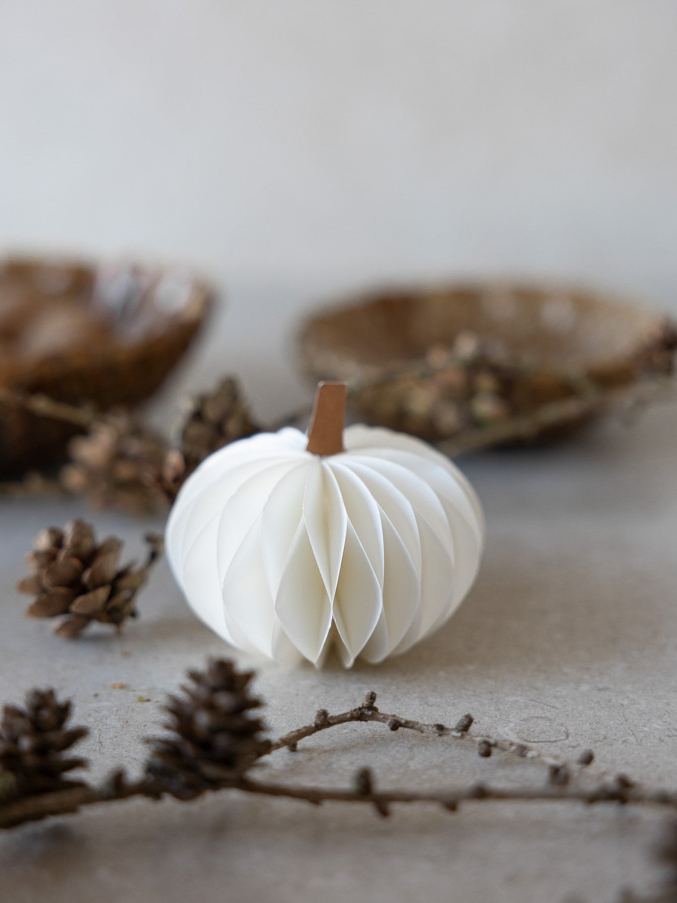 Dekoration i vitt papper, perfekta att ha som höstdekorationer. Håll det enkelt med bara pumporna eller kombinera med andra höstprydnader från vårt sortiment. Dekorationerna är också vackra att hänga på en byrå, ett dörrhandtag eller pynta med på ett fat.