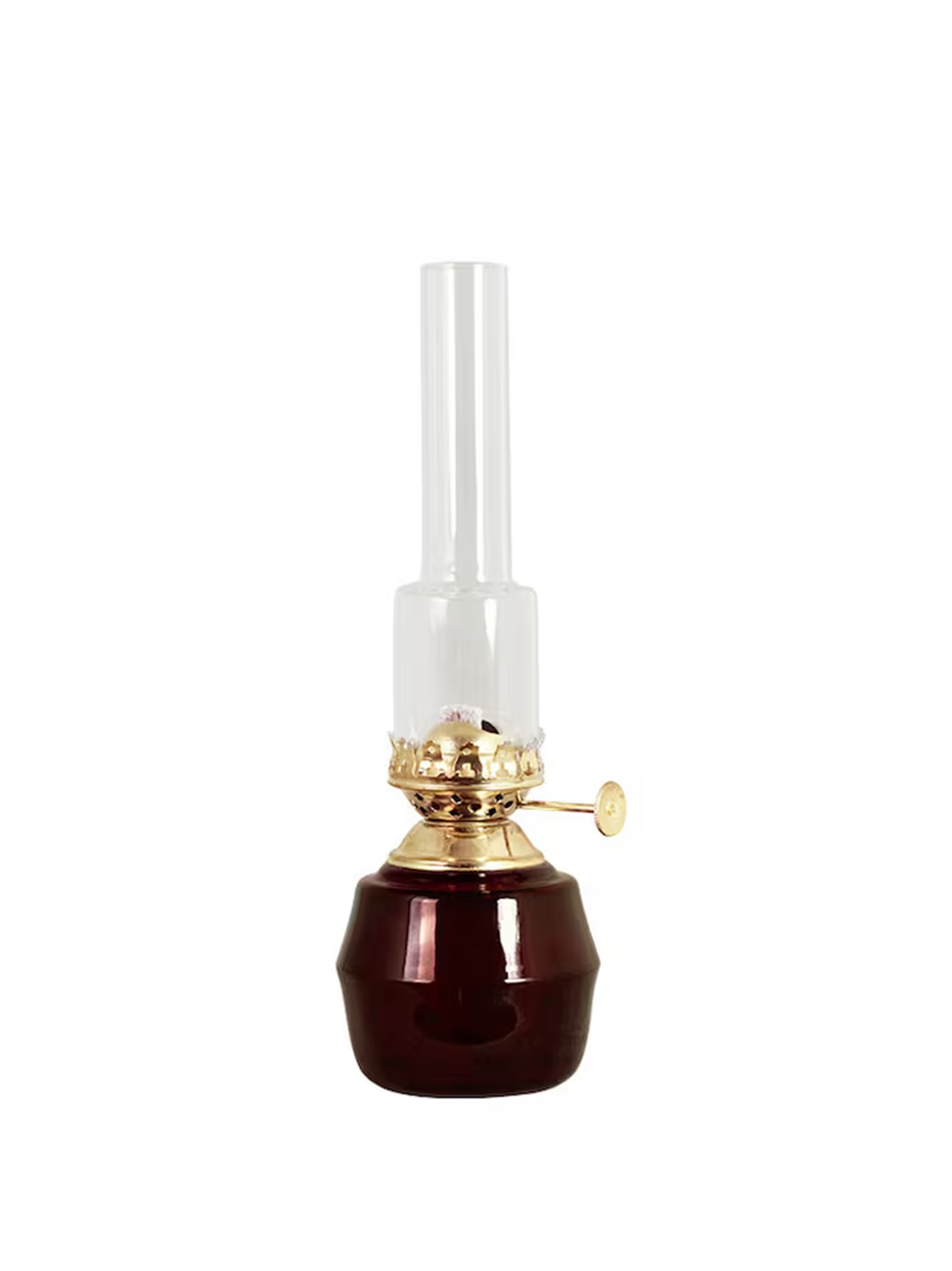 Fotogenlampa i infärgat vinrött glas vilket skapar en vacker färgad ton men samtidigt ger en genomskinlig yta. Brännarerör i klarglas och brännare i mässing. Inklusive en veke.