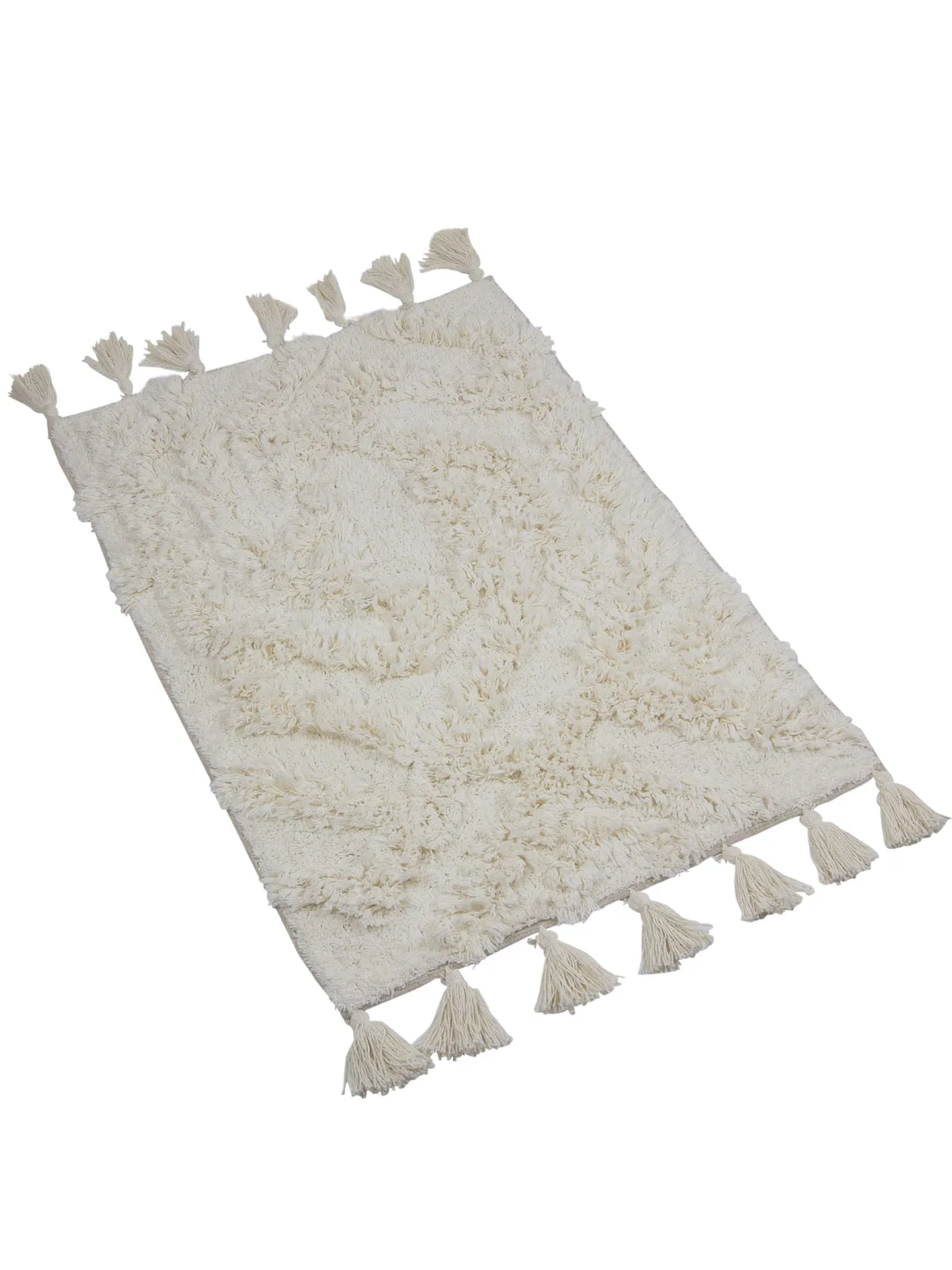 Matta i offwhite med dekorativt mönster och fransar på kortsidorna.