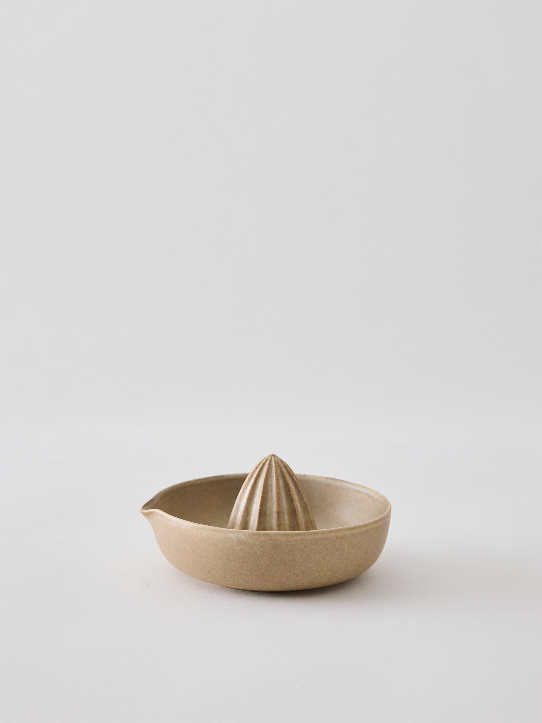Sandfärgad citruspress i glaserat stengods i reaktiv glasyr med rund form för effektiv pressning. En stilren och funktionell detalj till köket.