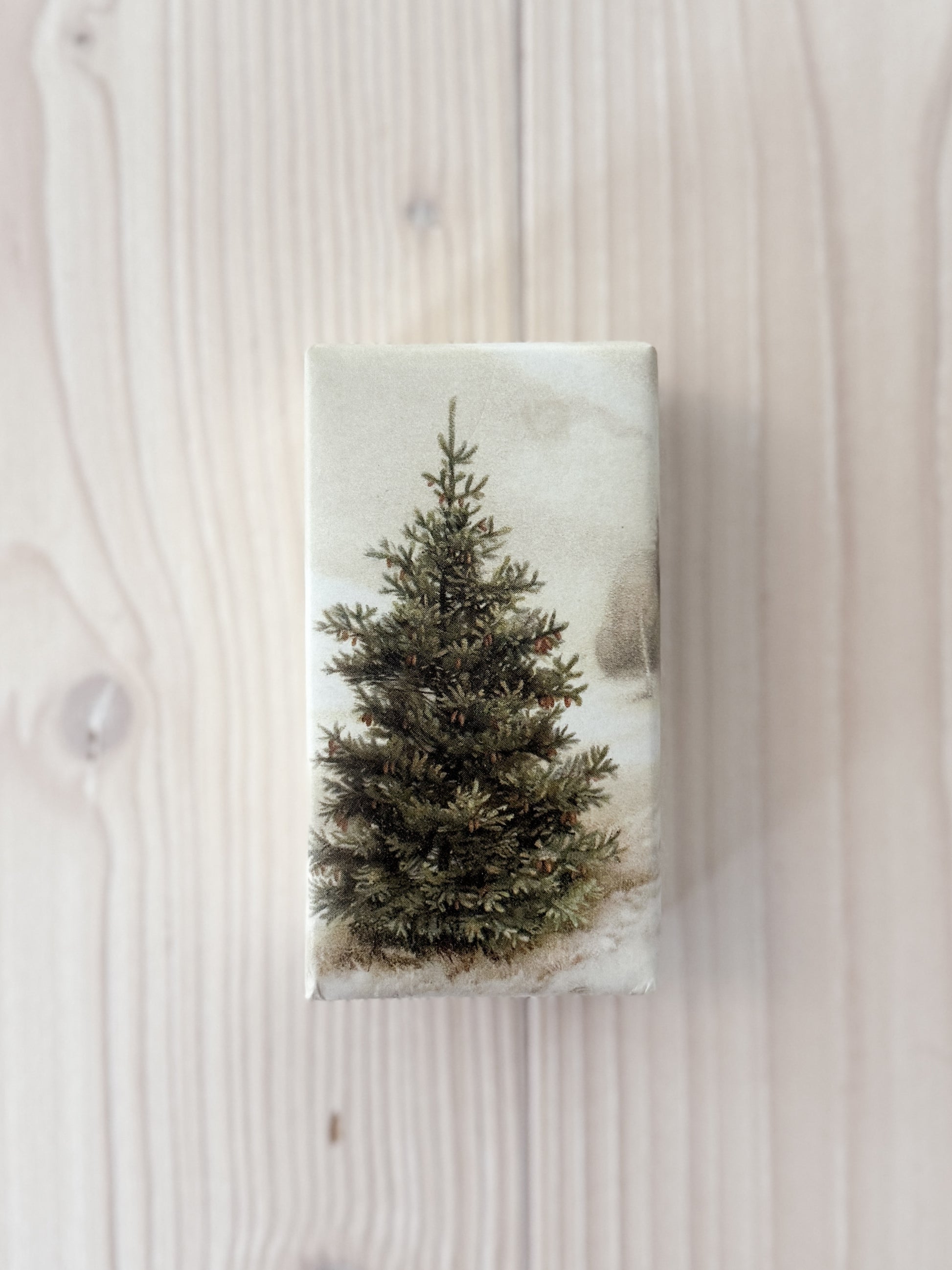 Tvål med doft av skog, vackert inslagen i papper med motiv av granar.
