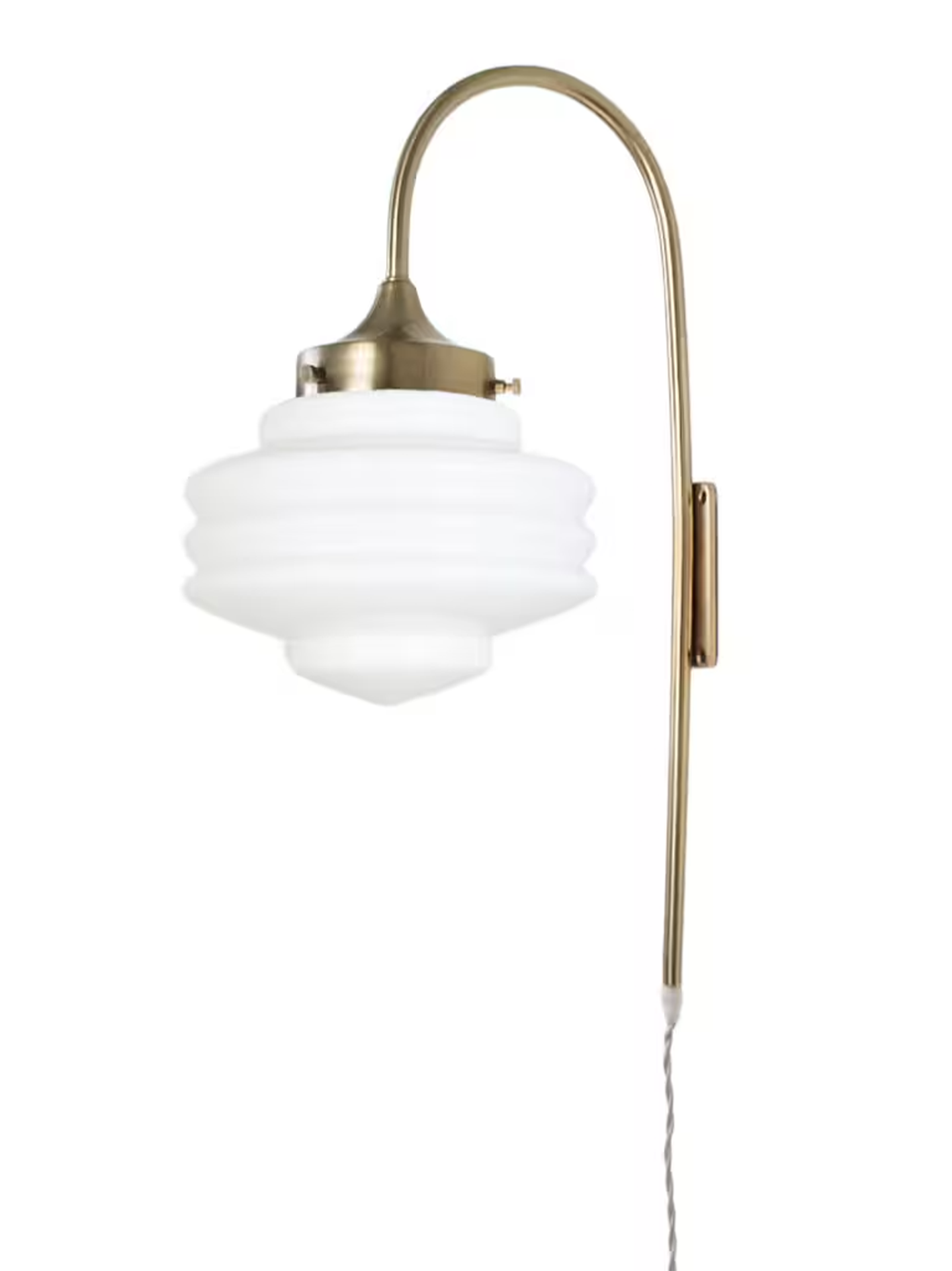 Elegant vägglampa i mässingsfinish med ett vackert opalglas i vitt. Kupans runda former sprider ett mjukt behagligt ljus, som tillsammans med lampfästet skapar ett tidlöst utseende som påminner om sekelskiftet. Lampans design är ett perfekt exempel på hur enkelhet och elegans smälter samman, där vackert glas och solid metall förenas i en harmonisk kombination.