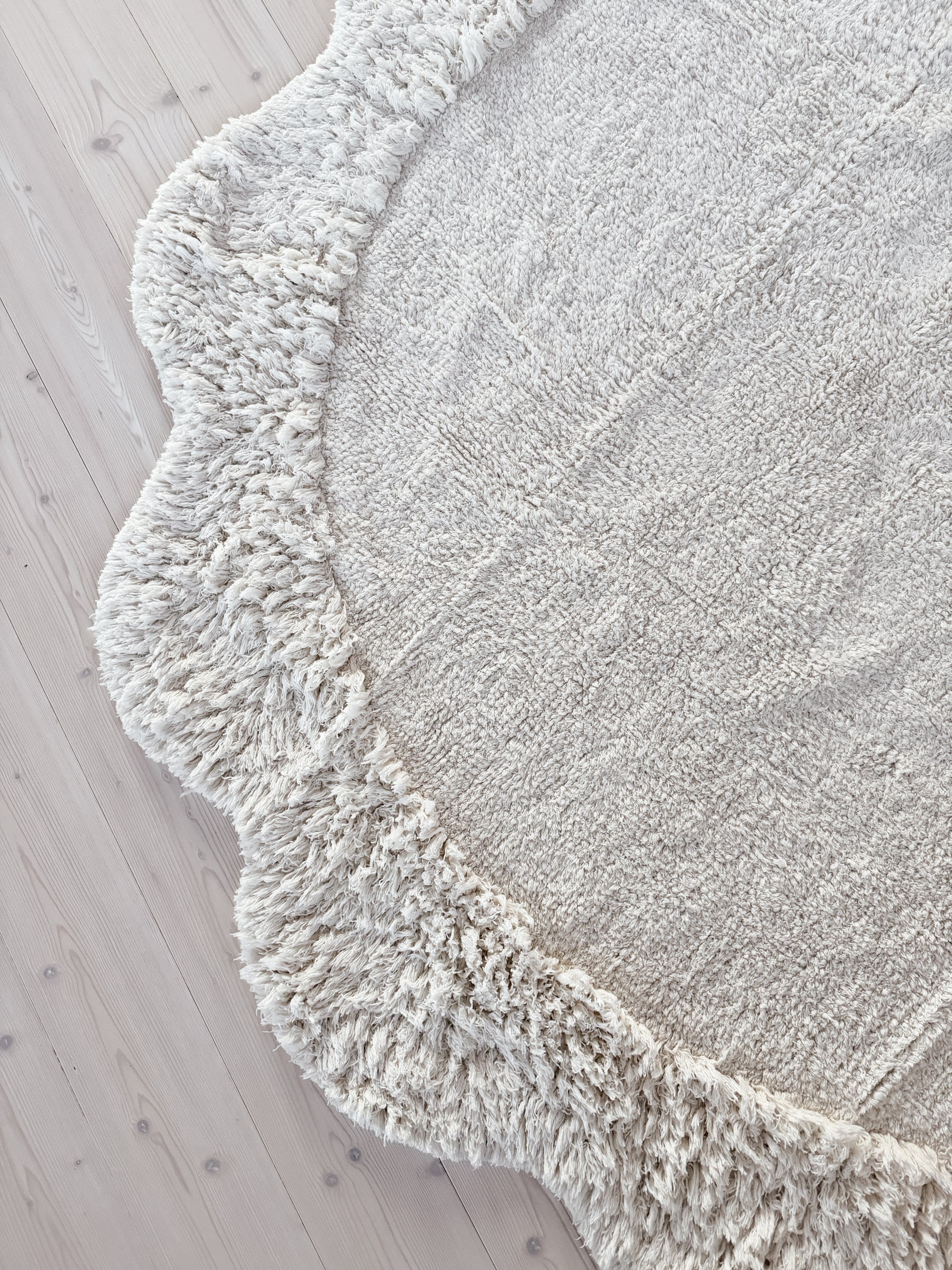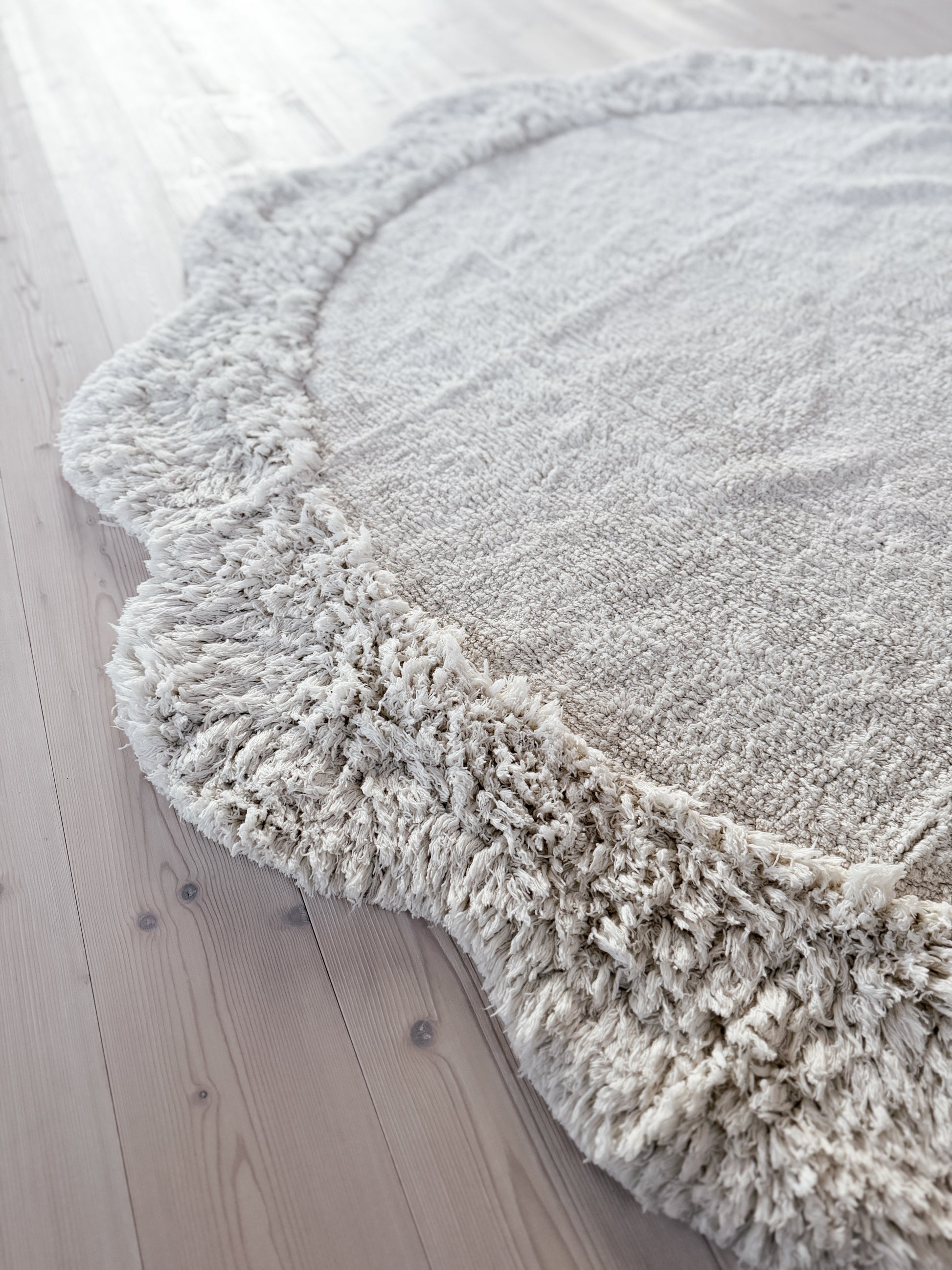 Tuftad bomullsmatta med en bågad, något högre kant som ger en mjuk inramning och ett elegant uttryck. Den tuftade strukturen skapar en behaglig, taktil känsla under fötterna och tillför rummet värme och textur.